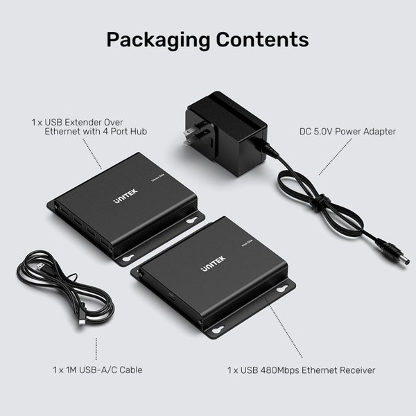 Thông số kỹ thuật: Bộ kéo dài tín hiệu USB 1-4 qua cáp mạng Cat6 dài 150M chuẩn 2.0 Unitek U1222ABK01-EU cao cấp