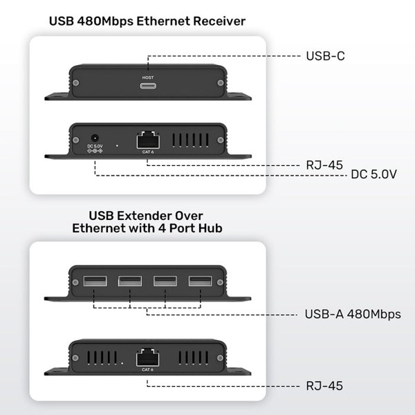 - Tính năng: Kéo dài tín hiệu USB 2.0 lên đến khoảng cách 150M bằng cáp mạng CAT6