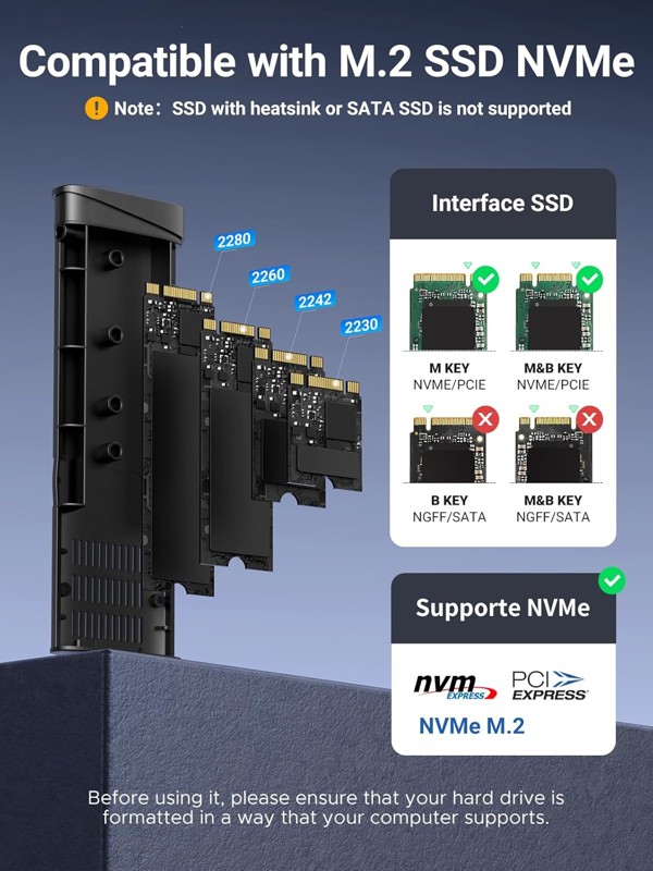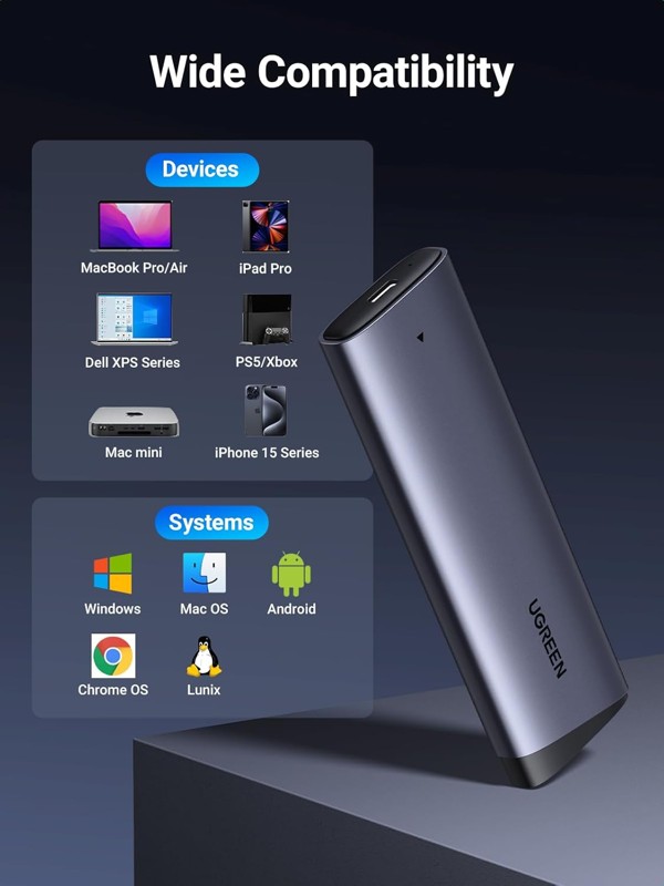 Vỏ ổ cứng SSD M.2 NVMe Ugreen 35267 được thiết kế đặc biệt để hỗ trợ các khóa M/B&M giao thức NMVe và cho các ổ SSD kích thước 2230/2242/2260/2280 lên đến 8TB. Vỏ ổ cứng M.2 NVMe tương thích với các hệ điều hành Windows, Mac OS, Linux, Android và IOS. (Không hỗ trợ SSD SATA NGFF, SSD mSATA và SSD có tản nhiệt)