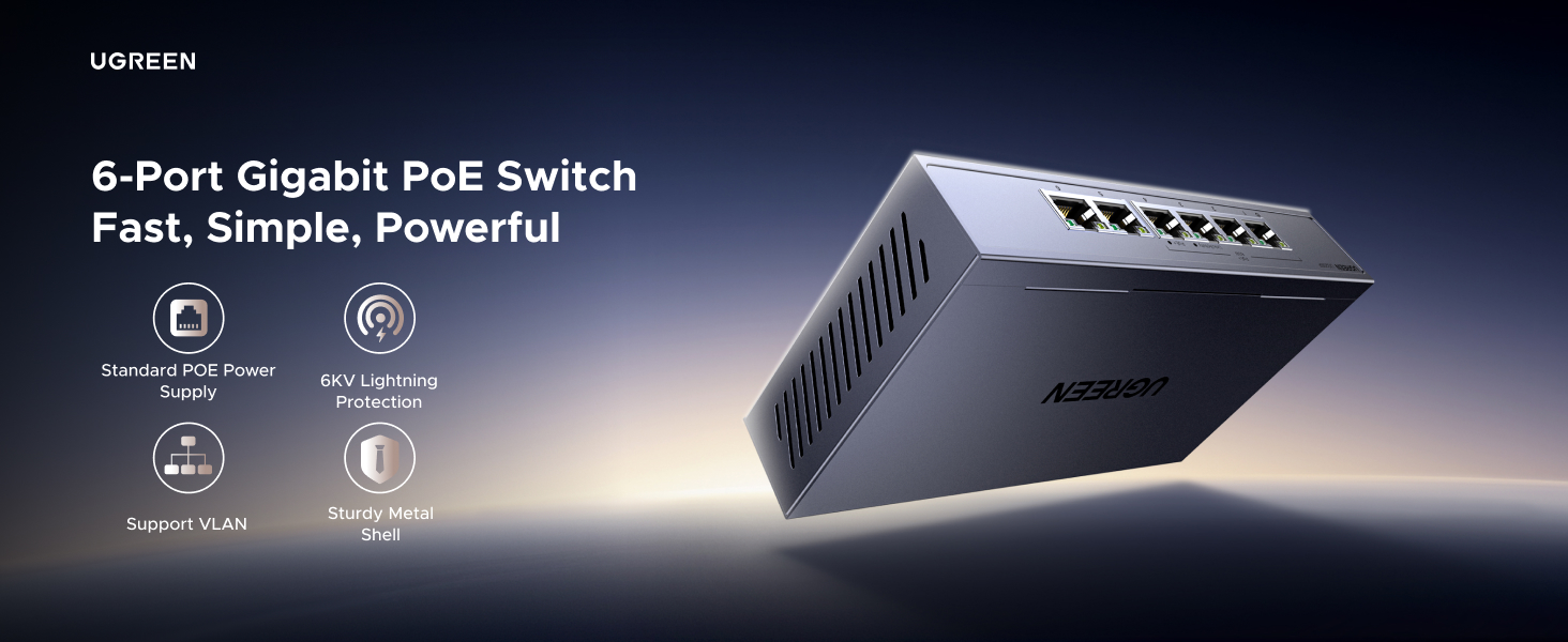 Switch chia mạng 6 cổng LAN Gigabit hỗ trợ POE 60W Ugreen 35371 cao cấp (EU Plug)