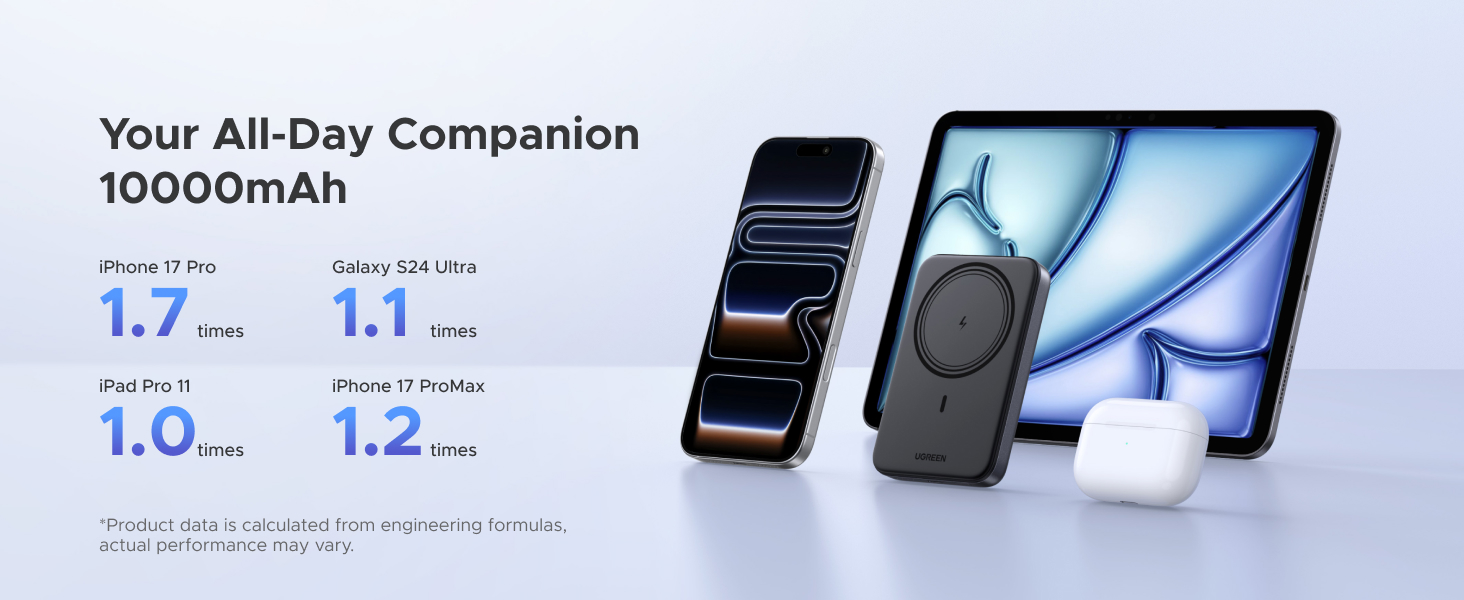 Được trang bị pin Li-polymer mật độ cao 10.000 mAh, sạc dự phòng này có thể sạc đầy iPhone 15 Pro khoảng 1,8–1,9 lần trong điều kiện bình thường. Kết quả thực tế có thể khác nhau tùy thuộc vào kiểu máy, môi trường sạc và thói quen sử dụng. Lý tưởng cho các cuộc gọi, video và âm nhạc cả ngày.
