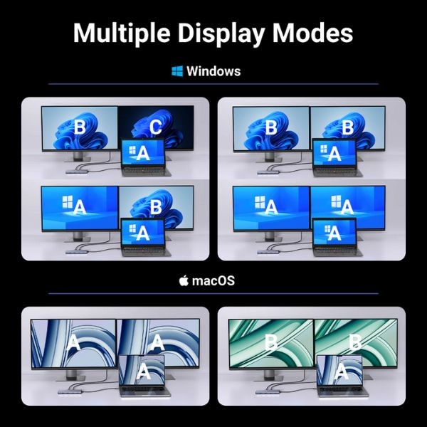 Dual 4K HDMI hỗ trợ xuất hình ảnh với độ phân giải 4K@60Hz từ hai cổng HDMI, lý tưởng cho cấu hình màn hình kép hoặc kết nối với các thiết bị hiển thị cao cấp. (Extend đối với window, duplicate đối với Mac )