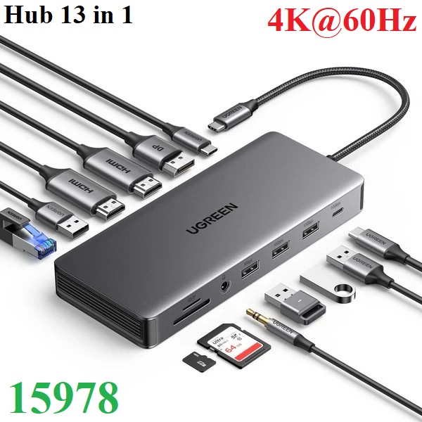 Trạm kết nối USB-C 13 trong 1 Ugreen 15978 khai thác tối đa tiềm năng của cổng USB-C trên máy tính xách tay của bạn với hai cổng HDMI, một cổng DisplayPort, một cổng USB-C 3.2 Gen 2 tốc độ 10 Gbps, hai cổng USB-A 3.2 Gen 2 tốc độ 10 Gbps, hai cổng USB A 3.0, hỗ trợ nguồn 100W, cổng RJ45 3.5MM và đầu đọc thẻ SD/Micro SD.